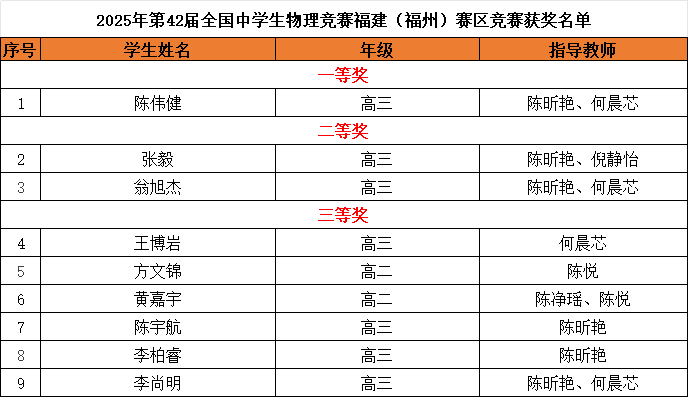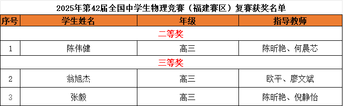 近日,2025年第42屆全國中學生物理競賽落下帷幕。我校學子憑借扎實的學科素養(yǎng)與不懈的拼搏精神再創(chuàng)輝煌,在福州市預賽、福建賽區(qū)復賽中捷報頻傳——累計12人次斬獲獎項,其中省級獎項3人次、市級獎項9人次,用亮眼成績書寫了我??苿?chuàng)教育的新答卷!